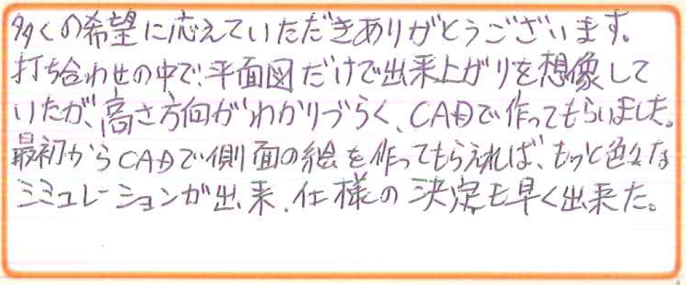 打ち合わせの中で、平面図だけで出来上がりを想像していたが、高さ方向がわかりづらく、CADで作ってもらいました。最初からCADで側面の絵を作ってもらえれば、もっと色々なシミュレーションが出来、使用の決定も早く出来た。